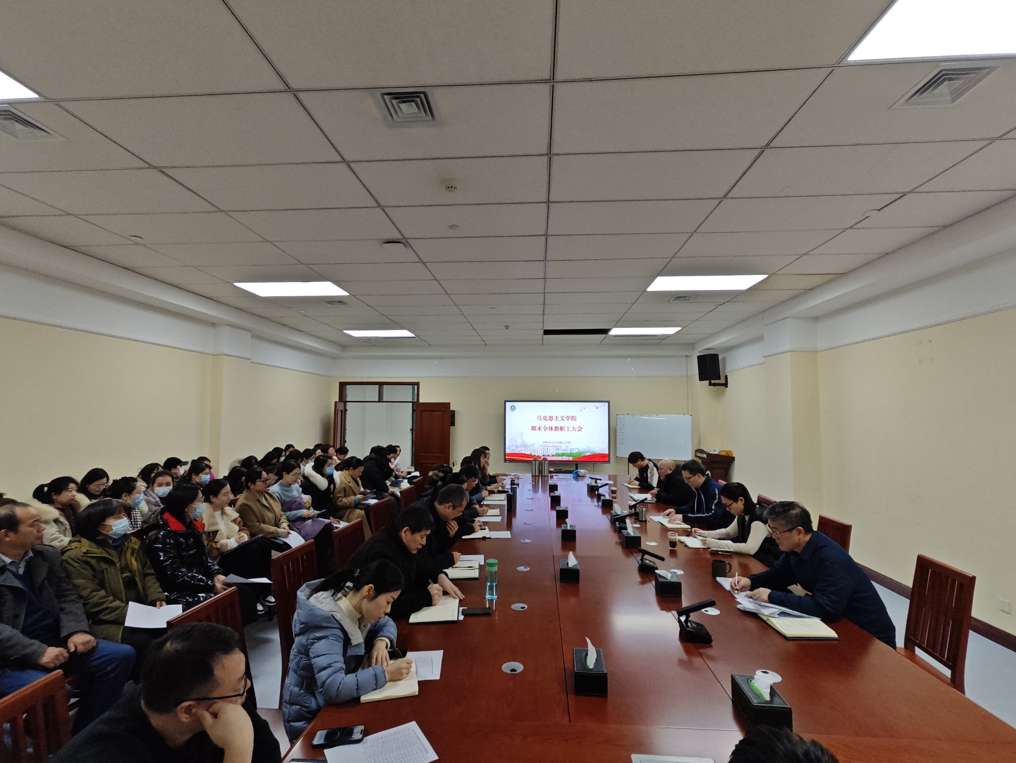 会议通报了期末考试相关工作、职称评审事宜和财务工作。