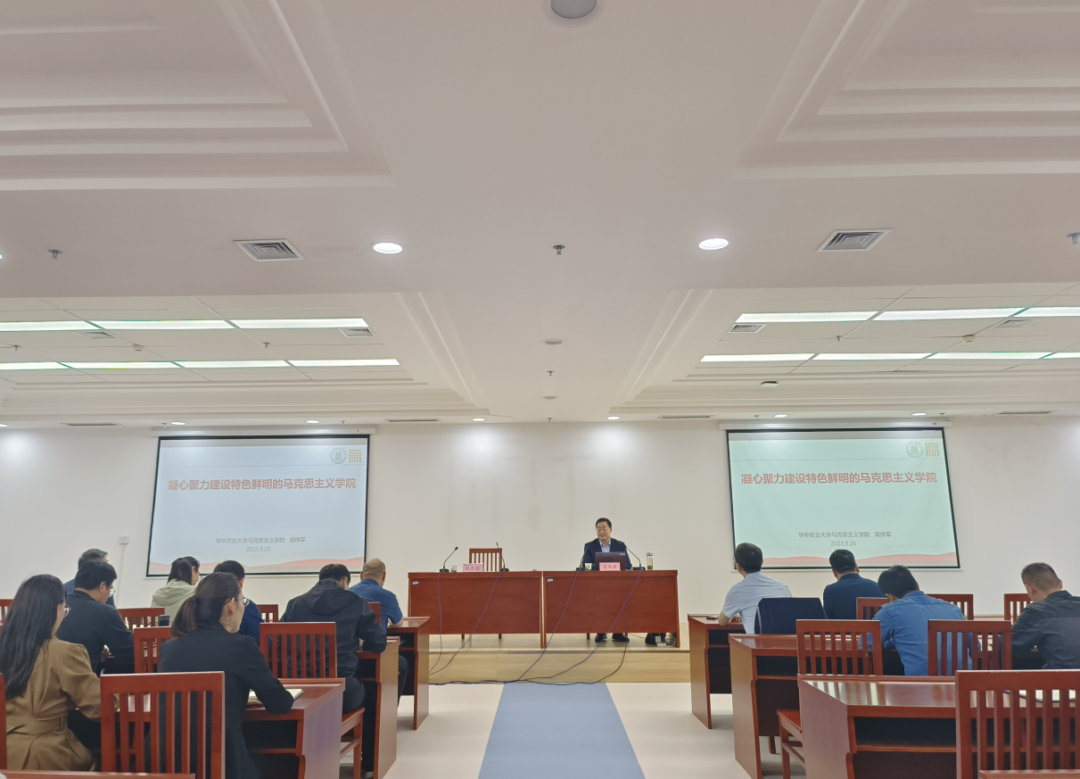 的情况进行了介绍。他围绕师资队伍建设、思政课教学改革、青年教师人才培养、突出“三农”相结合的教研、教改和科学研究成果等工作进行了分享。他针对研究生人才培养,就学科方向、招生规模、培养条件、学术活动、出国访学、就业发展等方面充分扩展交流。他提出研究生培养要对标对表,通过理论宣讲、技术帮扶、理论阐释等方式提升研究生学术研究能力。最后,梁伟军强调政治建院、教学立院、人才强院、学科兴院是马院事业发展主题主线;锐意进取、守正创新是马院事业发展的基本原则;培根铸魂、启智润心是马院人才培养的根本要求。