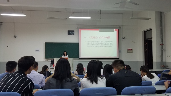 靳戈同学首先从《实践论》的写作背景、主要内容方面为同学们做了简单概括,对于什么是实践、实践和认识的辨证关系、实践与真理、认识的辨证过程以及认识的规律性做了详细的讲解,丰富了同学们的学科理论知识。其次,靳戈同学分析了当前研究生培养中在实践方面存在的短板及其原因。最后,靳戈同学针对《实践论》对研究生培养的重要意义方面做了分析,分别从理论意义和现实意义两方面进行了总结。