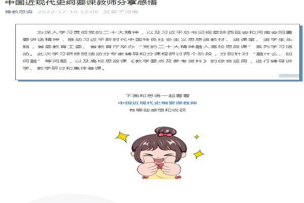 (张璐 刘梦迪 文\图)为深入学习贯彻党的二十大精神,以及习近平总书记视察陕西延安和河南安阳重要讲话精神,推动习近平新时代中国特色社会主义思想进教材、进课堂、进学生头脑,省委教育工委、省教育厅举办“党的二十大精神融入高校思政课”系列学习活动。此次学习研修班活动分专家辅导和分课程研讨两个阶段,分别针对“融什么、如何融”等问题,以及高校思政课《教学要点及参考资料》的综合运用,进行辅导讲学、教学研讨和集体备课。2022年12月16日中心“豫教思语”公众号刊发了研究人员王榆芳博士作为中国近现代史纲要课程教师代表的如下教学感悟: