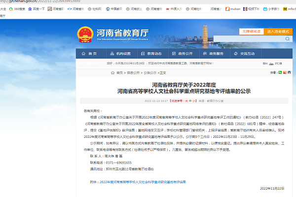 (张璐 刘梦迪 文 王怡爽 图) 根据2022年11月22日河南省教育厅官网发布的《关于2022年度河南省高等学校人文社会科学重点研究基地考评结果的公示》 文件显示:根据《河南省教育厅办公室关于开展2022年度河南省高等学校人文社会科学重点研究基地考评工作的通知》(教办社语〔2022〕247号)《河南省教育厅办公室关于开展2022年度全省高校人文社会科学重点研究基地网络考评的通知》(教社语函〔2022〕681号)精神,经各基地自评,提交《基地评估指标》自评结果;基地网络交叉互评;学校社科管理部门复核把关,上报评审结果;省教育厅组织有关人员审核确认。现将2022年度河南省高等学校人文社会科学重点研究基地考评结果予以公示。公示期5个工作日:2022年11月23日-11月29日。 (链接://jyt.henan.gov.cn/2022/11-22/2643945.html)
