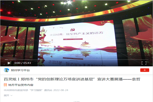 袁哲同学在代参赛过程中重点畅谈了关于共产主义的所思所想,以鲜活生动的事例,质朴简洁的语言,生动讲述了广大干部群众喜迎党的二十大、学习宣传贯彻习近平新时代中国特色社会主义思想的认识和感受,展现了新时代郑州市各条战线、各个领域干部群众的新作为、新风采。比赛结束后,郑州市相关部门向“学习强国”推荐的8个宣讲视频作品中袁哲同学又次成为唯一被入选播出的的作品,百灵炫丨郑州市“党的创新理论万场宣讲进基层”宣讲大赛频道展播。这表明,中心研究人员近年来倡导的读经典、搞实践的科研育人模式是符合学生长远成长需要与社会高层次发展需求的。