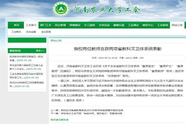陈娱教授获河南省教科文卫体系统“最美教师”称号
