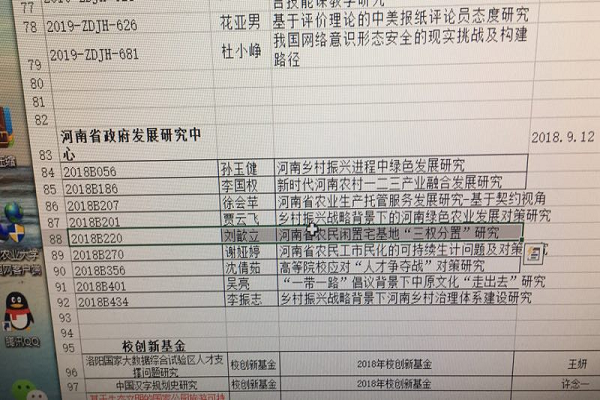 近日,我中心副主任刘歆立副教授日前获批两个省级项目:河南省政府决策招标项目“河南省农民闲置宅基地‘三权分置’研究”(立项编号:2018B220)与河南省重点研发与推广专项(软科学)项目“经济新常态背景下我省农民市民化灰色预期因类施策及其应对”(立项编号:192400410105)