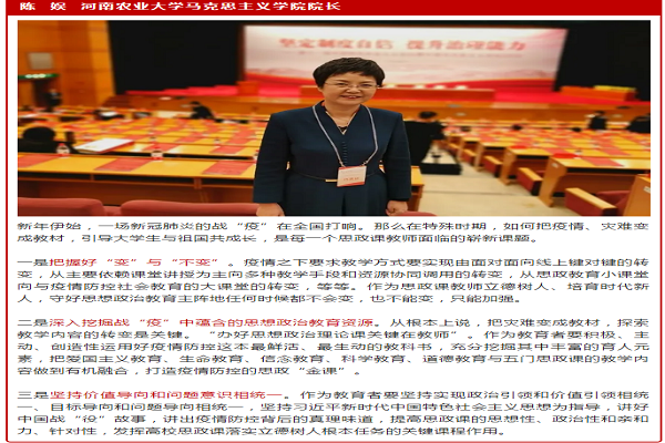 陈娱教授发言的主要内容有:新年伊始,一场新冠肺炎的战“疫”在全国打响。那么在特殊时期,如何把疫情、灾难变成教材,引导大学生与祖国共成长,是每一个思政课教师面临的崭新课题。