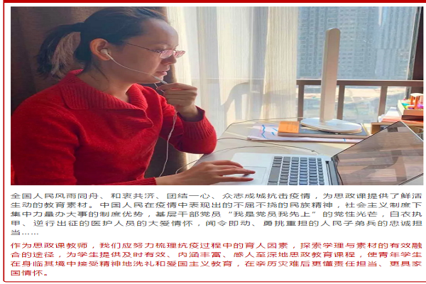 作为思政课教师,我们应努力梳理抗疫过程中的育人因素,探索学理与素材的有效融合的途径,为学生提供及时有效、内涵丰富、感人至深地思政教育课程,使青年学生在身临其境中接受精神地洗礼和爱国主义教育,在亲历灾难后更懂责任担当、更具家国情怀。