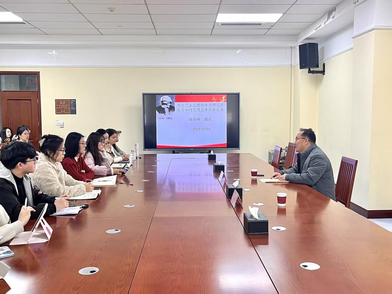 路向峰以“马克思主义理论专业研究生应该如何度过三年学术生活”为主题,在明确“读原著、悟原理、勤实践、早规划”的学术生活核心方向的同时,针对论文写作提供了关键指导。路向峰强调,研究生既要系统钻研经典著作、真切领悟基本原理,将读经典、悟原理内化为生活习惯与精神追求,在学术实践中展现马克思主义的真理力量;也要重视论文写作的规范性与逻辑性,从选题的理论契合度、论证的学理严谨性、表达的学术规范性等维度夯实写作基础,以高质量论文成果践行理论学习与学术研究的统一。
